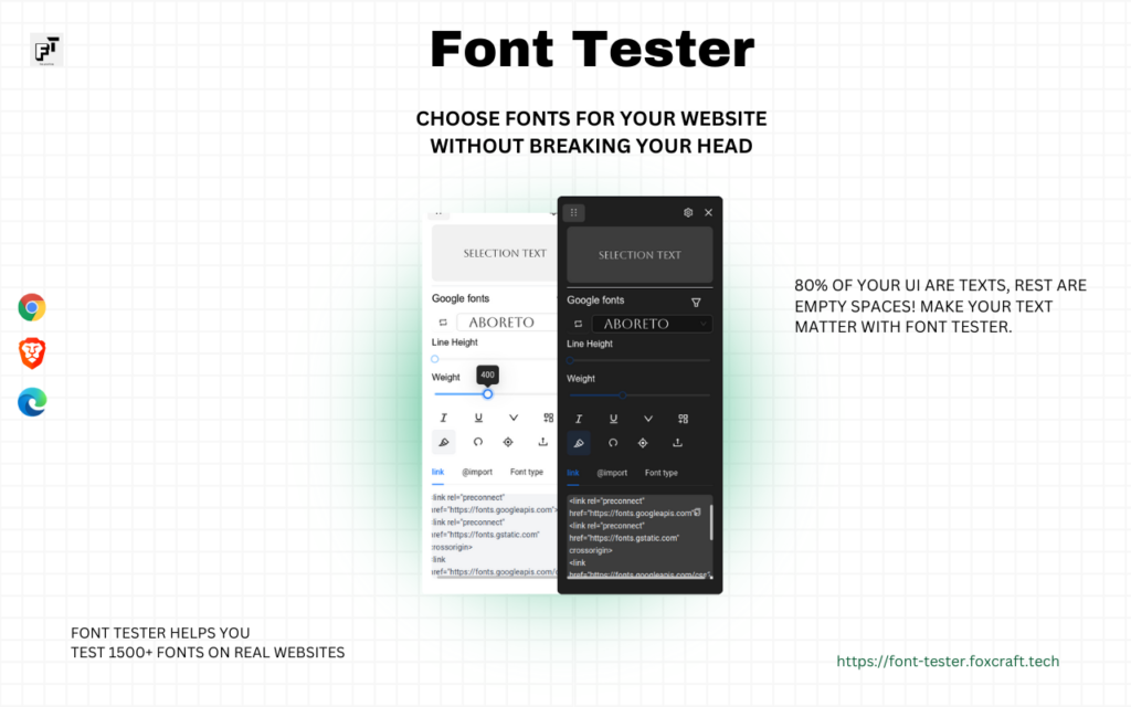 Google Fontsのディレクトリから好きなフォントを選択し、閲覧中のWebサイトに適用できる便利なツールです。実際のサイトでフォントの見え方を試せるため、デザイン決定前の検証に最適です。