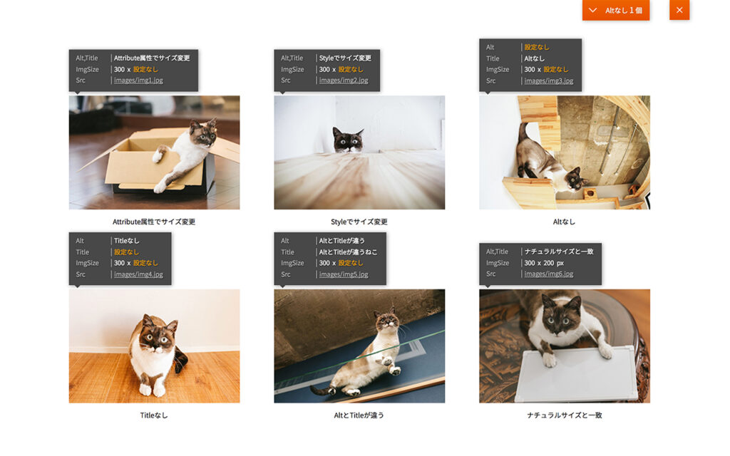 画像のalt属性とメタ情報を視覚的に表示してくれるツールです。アクセシビリティとSEO対策において重要なalt属性の設定状況を、ページ全体で一目で確認できます。