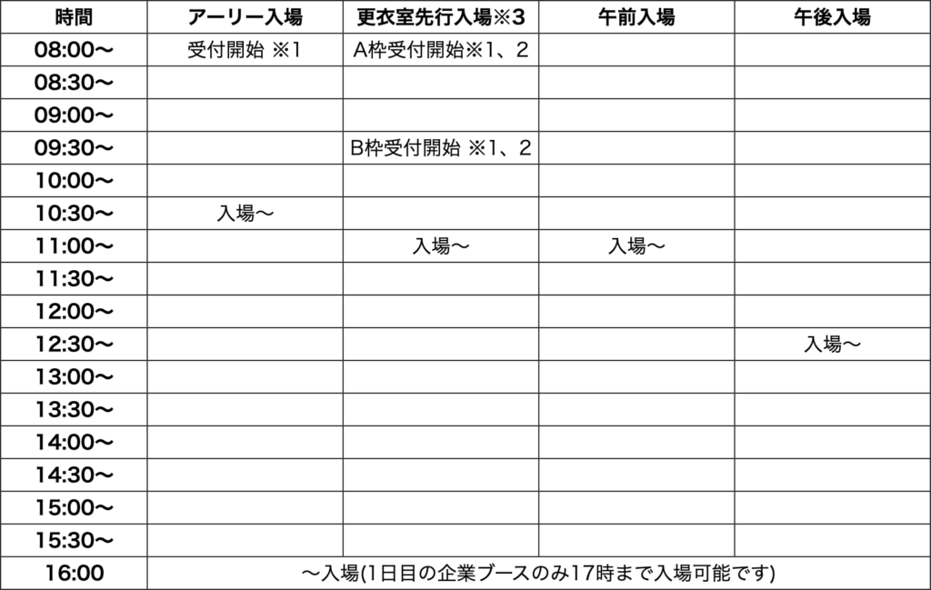 開催時間は一般参加者向けには10時30分から(予定)となっていますが、入場時間はチケットの種類によって異なります。