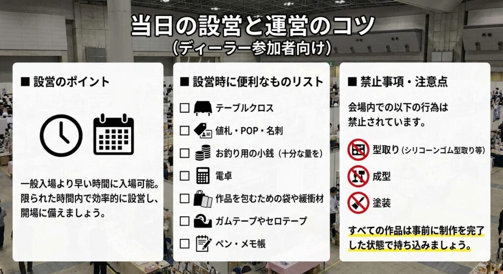 限られた時間内で効率的に設営を行い、開場に備えましょう。