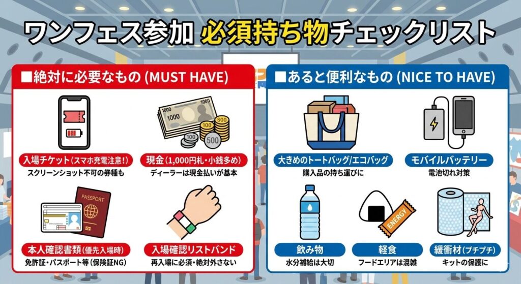 ワンフェス参加にあたって、忘れてはならない持ち物を確認しておきましょう。